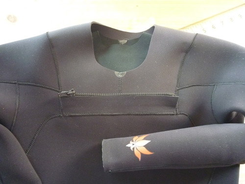 身体を入れる首回りには、ネックインスーツで首のパーツに使っている伸縮性600%のXTジャージを使っています。ストレス無く伸びるはずです。耐久性はネックインで実証済みです。