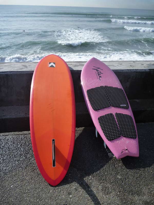 今日はこの2本。カツさんからお借りしたカスタムレングスのプリモ6’9”と5’6”のクアッドニーボードです。