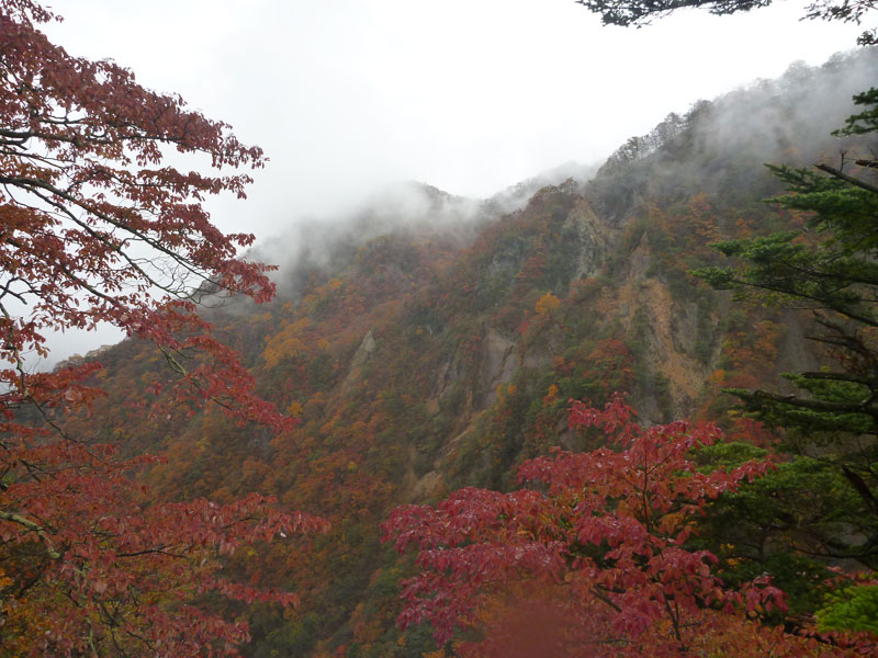 天気が良ければもっと色が映えると思いますが、これはこれで綺麗です。紅葉の名所というだけあって、色づき方が違うのには驚きました。色が違うのです。