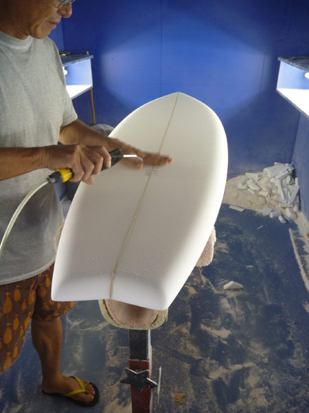 カツさん、シェイプ中のLOVEE。前寄りにワイデストポイントを持ってきた、十字架バランスのクラシックなシングルフィンです。なんとも言えずきれいな形で、それだけでもう調子よく波の上を走ってくれる気がしてきて嬉しくなってしまうアウトラインです。