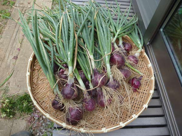 まずはタマネギを引っこ抜きます。赤タマネギがたくさんできました。根っこは良く洗って、素揚げにして食べてみます。ネギの根っこが美味しいのですから、タマネギもきっと美味しいと思います。