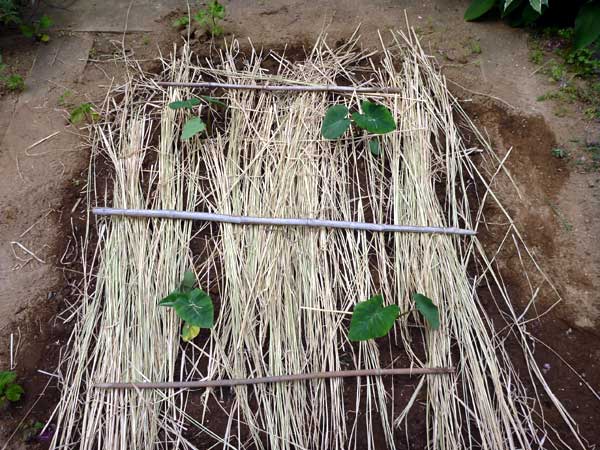 植えたのは八つ頭です。イモを育てるのは初めてです。近所の農家の真似をして藁を敷いてみました。もう少し敷いた方がいいかな?