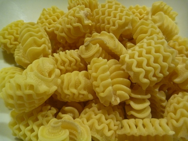 Marellaのスプニョーレというパスタ。オーガニックな美しい形状です。ヒダの間のパスタの肌面もソースがからみやすい形状になっていて、食べる以前に見ていて飽きないデザインです(クリックして拡大してみてください)