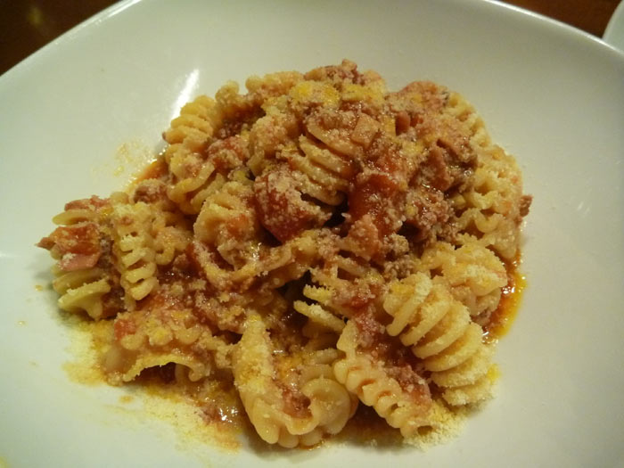 茹でるとさらにオーガニックな雰囲気になりましたが、もしかしてこのパスタのデザインのソースはトリッパか?ちょっとメカブみたいでもあります。トマトとひき肉のソースがよく絡んでくれて美味しくいただきました。