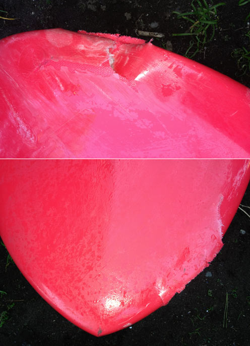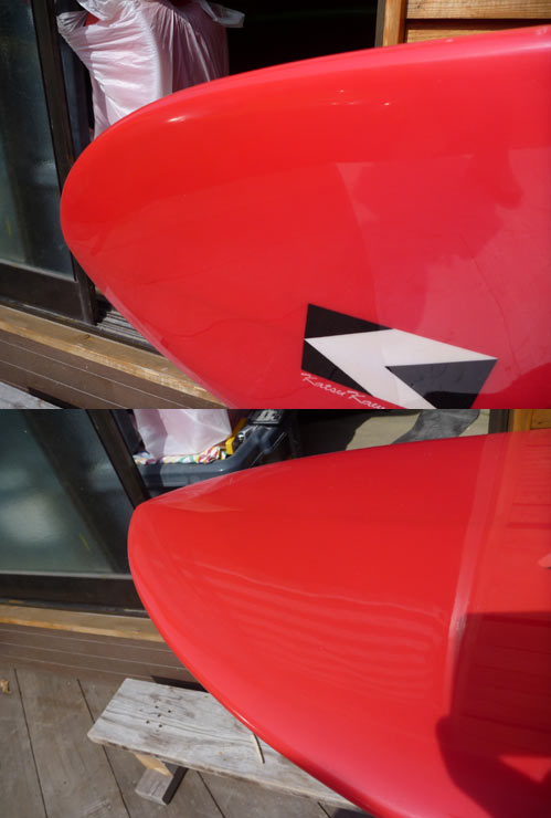キズがかなり大きかったので、新しくフォームを入れてシェイプをして色を合わせて仕上げています。言われても分からない仕上がりです。リペア職人もカツさんのライダーで、カツさんのシェイプをよく知っていますのでこんなときにも任せて安心です。