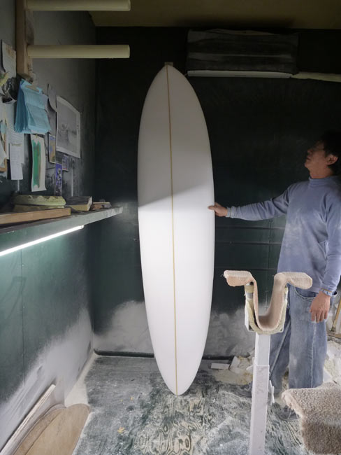今度はカツさんのシェイプルームです。いただいたオーダーの以来と内容の確認の打ち合わせです。新しいシェイプも楽しみで、削りあがったボードを見せていただいて、どんなシェイプなのかたくさん教えていただきます。これはプリモ。レギュラーのサイズと比べて、ノーズ、センター、テールと全体的に細くしているテストボードです。