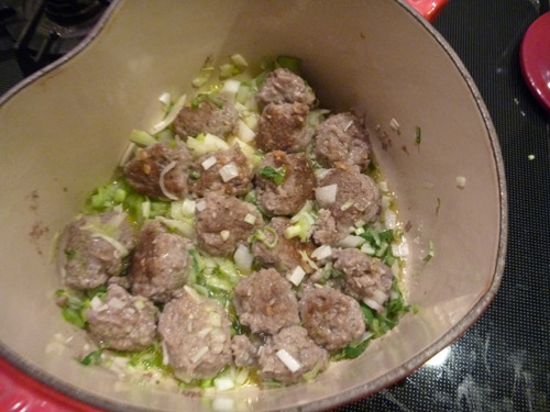 いわしのすり身にタイム、しょうが、レモンの皮と塩を加えてこね、鍋でオリーブオイルとニンニク、残り物の葉タマネギと一緒に軽く焼きます。いわしボールが崩れないようにひっくり返して両面焼きます。