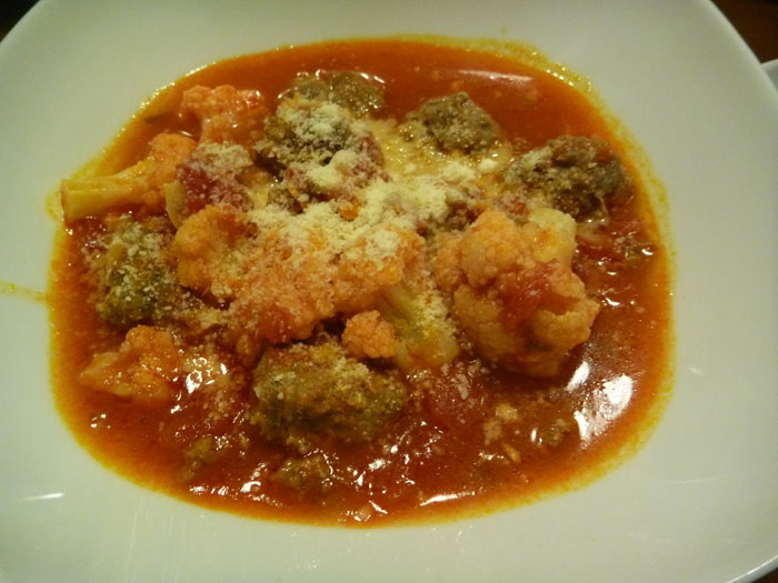 トマトの缶詰をひと缶入れて、白ワイン少しと水を加えて、冷蔵庫に残っているカリフラワーを入れて5分くらい煮込みます。塩味をつけてレモンを絞って出来上がり。