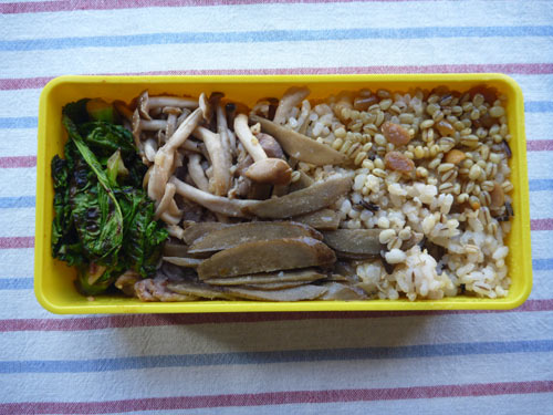 玄米と雑穀と豆少しのご飯にしめじと豚肉のダシ麹炒めにプチベールにゴボウのキンピラ。ご飯の横に乗っているのは島原納豆。近所のスーパーで売ってました。子供の頃に食べた記憶がある懐かしい味です。