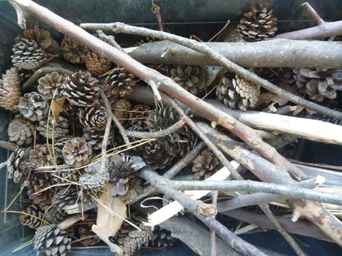 松ボックリと杉の葉を集めてきました。自然がくれるいい着火剤ですが、いろいろと考えさせてもくれることも多いのも事実です。