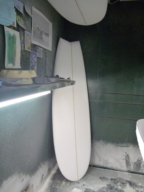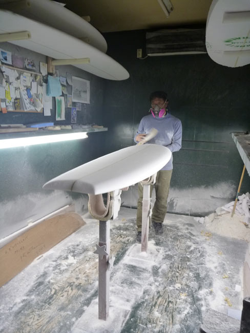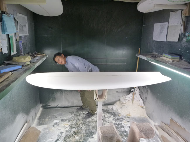 カツさんはシェイプルームでご自分で乗るテストボードをシェイプ中です。今年の台風シーズンでプリモと並んで活躍したというツインフィンです。