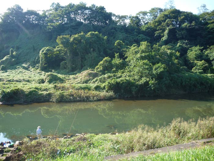 多摩川に近づくにしたがってだんだんと川幅が広くなっていきます。釣りをしている人がいました。なんだかいい風景です。