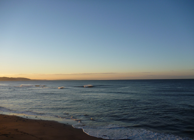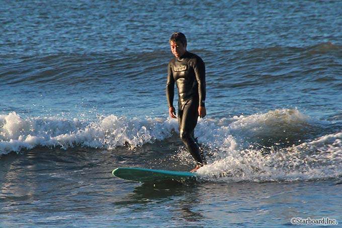 ロングボードだと沖のうねりからなんとなくでも乗れてしまうので乗りすぎ注意です。インサイド寄りにたまにできる、もうひとつのピークから何本か乗って足腰がほぐれてきたら、ニーボードにチェンジ。