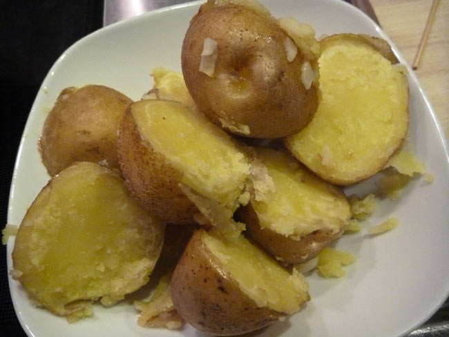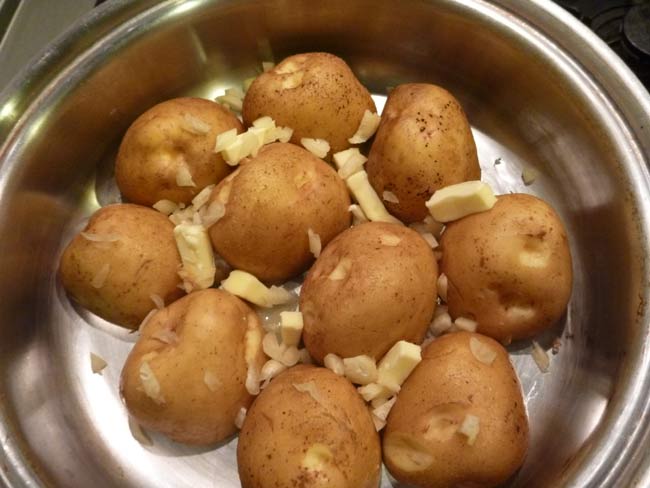 まずは我が家の定番の食べ方。洗って皮付きのまま半分に切って厚手の鍋に並べます。バターとニンニクをぱらぱらと乗せてフタをしてごく弱火にかけて30分。