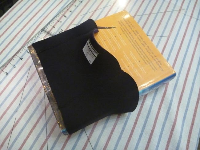 …なのですが、これを首の回りに巻き付け、その内側にネックを折り込むと首が圧迫されてちょっと苦しい。そこでこの真新しい生地を伸ばして柔らかくしてみることにしました。ここのパーツは600%も伸びないので、少し伸ばした状態で昨日から一晩放置。
