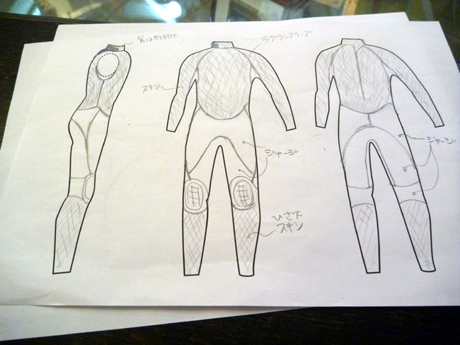 オリジナルのウェットもなんとなく出来上がりました。モモの前とコシの後ろの部分をラバーにするか、ジャージにするか選べるようにしています。コシのパーツのバランス次第で、ここに色を使っても面白くなるかもです。