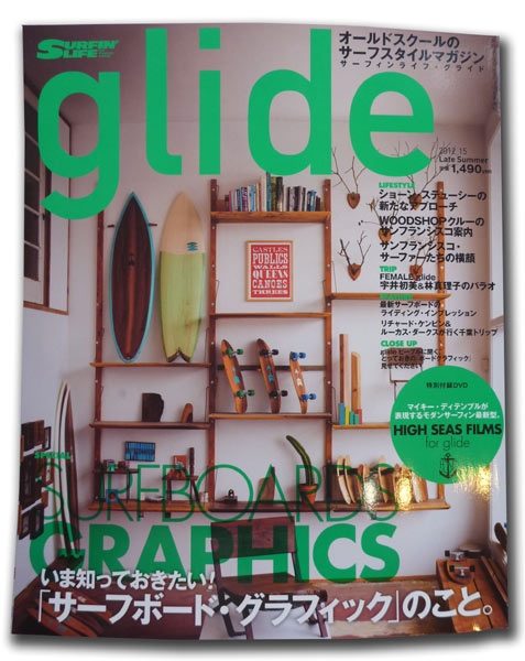 新しいグライドに、川南活さんのアートボードとクリステンソンが乗っています。特集はサーフボードのグラフィック。