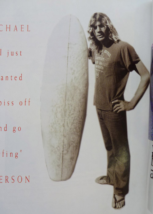 ボトムはコンベックスでフレックスしない大きなリジッドフィンがテールエンドにグラスオンされています。サイズは5’8”x 19”3/4 x 3”1/4。意外に細身です。あの映像の波ならこれで充分なんでしょうね(もちろん乗り手も)