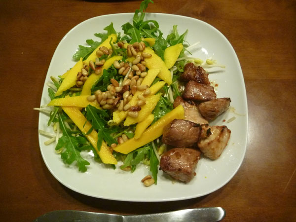 生もやしとルッコラを混ぜて、ナムプラーとレモンで味付け。上に乗っているのはマンゴーの千切りとナッツを炒ってハチミツで甘く味付けしたもの。生もやし、意外に美味しいです。減量中なので、晩ご飯はできるだけノーカーボにしています。