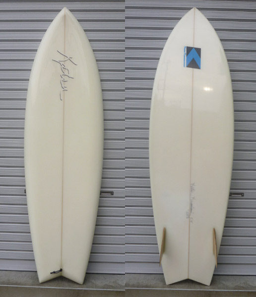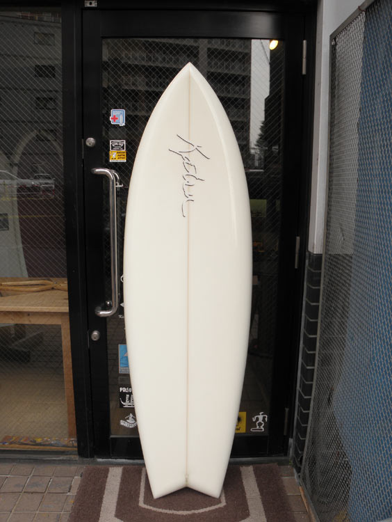 以前からシェイプしていて、ニューモデルというわけでは無いのですが最近人気上昇中のNUSHIモデルです。アウトラインはこんな感じ。フィッシュですがぽってりしたノーズのKK FISHと比べると、ノーズは細めで、フィッシュの進化版のロケットフィッシュ風のアウトラインです。