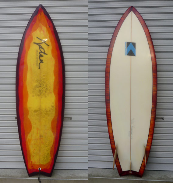 勝手にバレルコンケーブと命名しました。強いVEEボトムに樽(バレル)みたいな丸く深いコンケーブが掘ってあります。フィッシュ・フライには妙なボード、奇をてらったような変わったボードもたくさん並んでいますが、こういう変わり方は正統派の変わり方だと思いました。乗ってみたかったです。