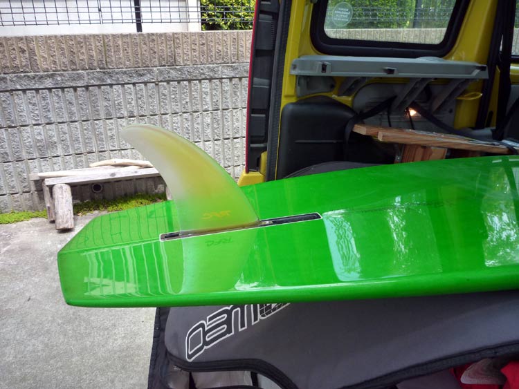 ちょっと引っ掛かり気味だったのはフィンの位置のせいかと思いながらも一発目からいい感触です。シングルフィンではベースがしっかりしていて、先端にかけて細身の高さがあるフィンを好む私ですが今回はあえて小さめでレイクが少ない三角形をしたクラシックなタイプを選んでみました。フィンの位置はテールから手の平で測ったいつもと同じ位置。ちょっとひっかかり気味でしたが今日はこのまま変えずに使ってみることにしましょう。