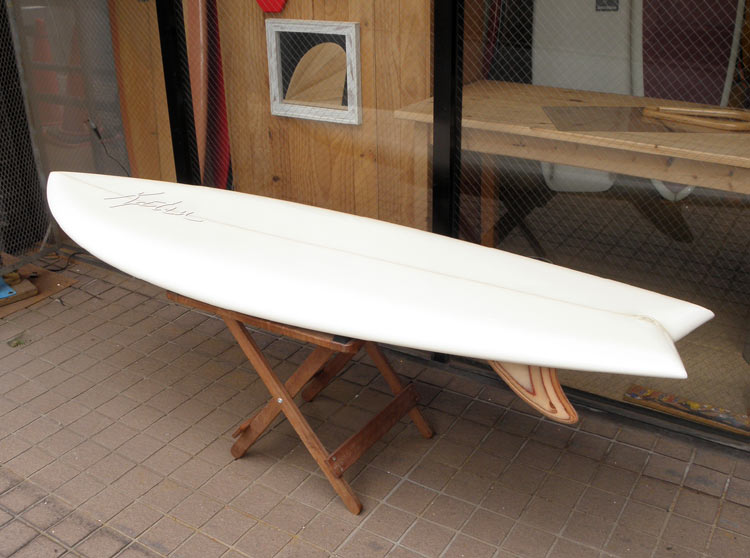 そもそも突然にこのサイズのシングルフィンを作ろうと思い立った理由は、自分の波乗りのスタイルを見直してみようと考えたからです。ご存知のとおり私はログのスタイルにあこがれてロングボードで波乗りをはじめました。ロングボードからクラシックつながりでトランジションタイプのボードに興味を持ち乗り始めたのは2001年ごろからです。