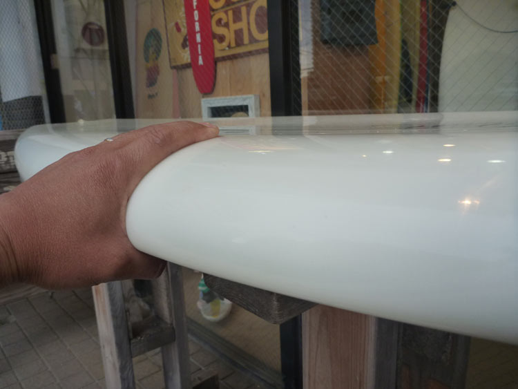 レールはボリューム感たっぷりのダウンレール。昔(70年代)はもっとぶ厚かったそうです。クラシックに見えるディテールですが、このレールが調子いいんです。カツさんはリアルタイムでこのダウンレールの時代にシェイプをして実際に乗っているので、何が良くて何がダメだったかよく知っておられます。