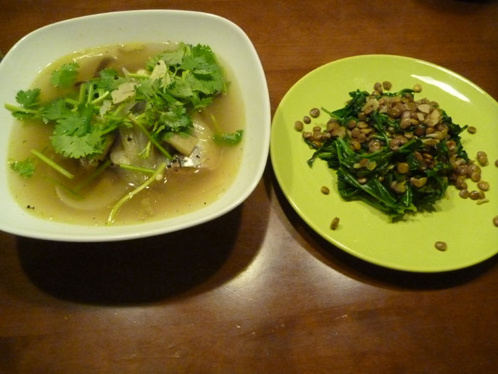ルッコラの炒め物、香りが良くて美味しいです。隣はイワシのスープ。カツさんが島に住んでいた頃に食べていたサカナのスープのお話を聞いていたら食べたくなって作ってみました。旨かったです。