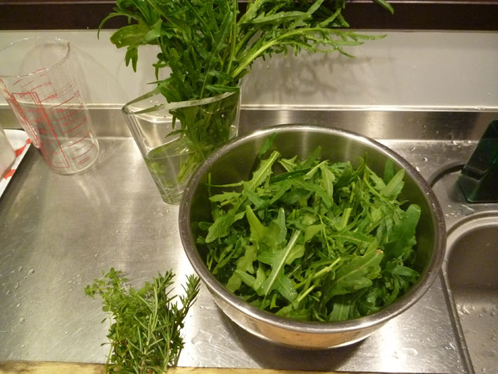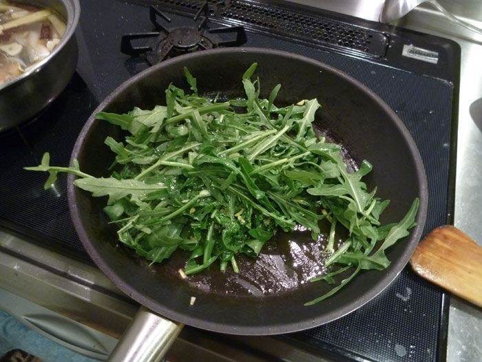 オリーブオイルとニンニクで炒めます。ルッコラというとサラダが思い浮かびますが、こんな食べ方もできます。まあ雑草のように茂っているからできるんですが、普通はかなり贅沢な使い方かも。