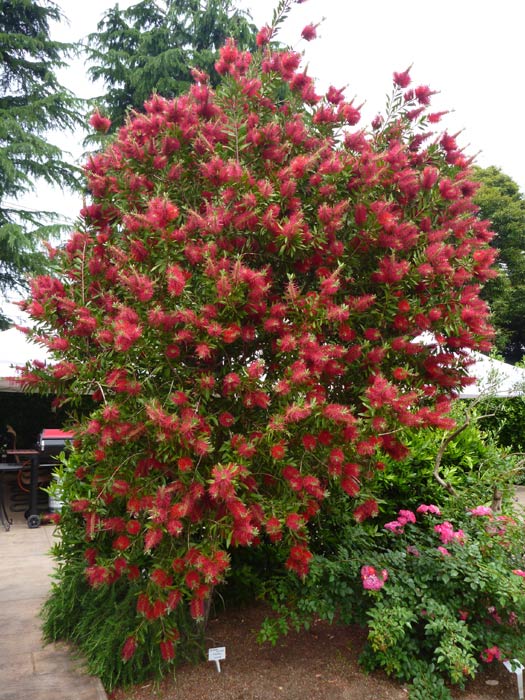 こんなめずらしい木も。通称ボトルブラシツリー。その名の通りに花の形がグラスやボトルを洗うブラシみたいです。ちょうど花の季節のようですね。