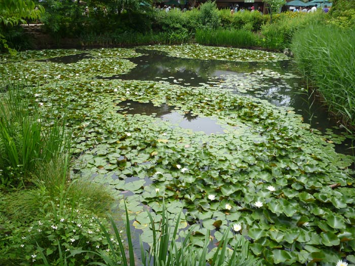 睡蓮の池。少し咲いてます。睡蓮は夜花が閉じて眠っているようなところから名前が付いたのですが、水面に浮かぶ独特な形の葉とその間から突き出るように咲いている花を見ているとなんとなく午後の眠たげな雰囲気になってくるのは私だけか?好きな花です。