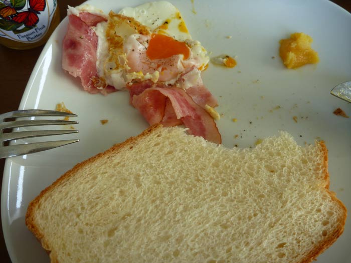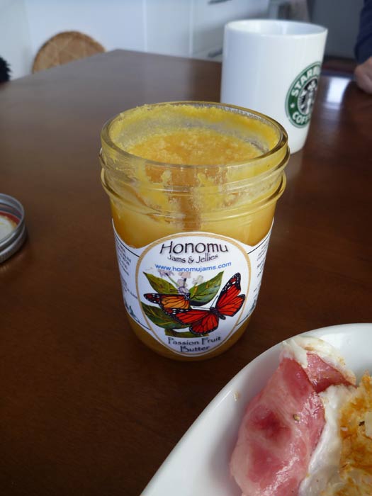 ベーコンエッグとホームメイドパンにコーヒーな朝ごはん。ハワイのファーマーズマーケットで買った、リリコイバターをパンに塗るとたちまち南の島になります。リリコイとはパッションフルーツのこと。パッションフルーツの香りが弾けるトロピカルなバターです。