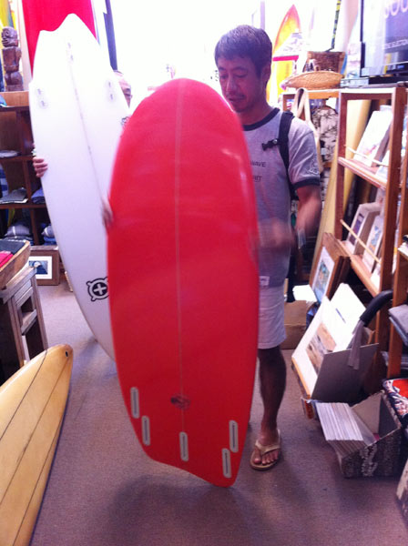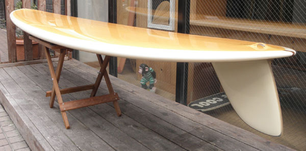 デッキにすこーしだけ浅いフットマークがついていますが、ピカピカのコンディションです。60年代っぽいキャンディカラーのデッキに微妙なティントカラーで着色したボトムとレール。ストリンガーはレッドウッド。フィンは特別製。ラミネートはボランではなく、6オンスのクロスでデッキ3層、ボトム2層と通常より一枚ずつ多いエクストラクロスを追加してラミネートしたスペシャルボードです。
