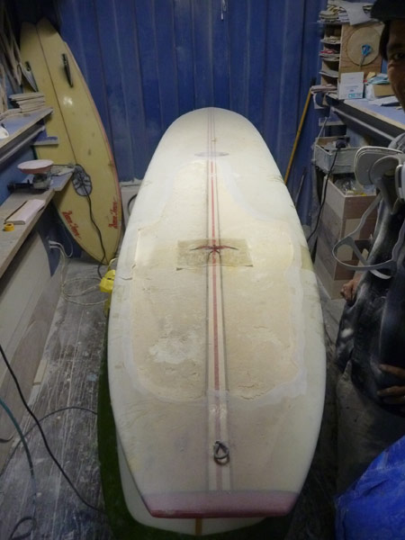 今回は少々大仕事。熱と浸水で気が付かないうちに大きく痛んでしまったロングボードの再生です。愛着があるボードのようで、他所に持ち込んで修理できませんと断られてしまったのを引き受けました。