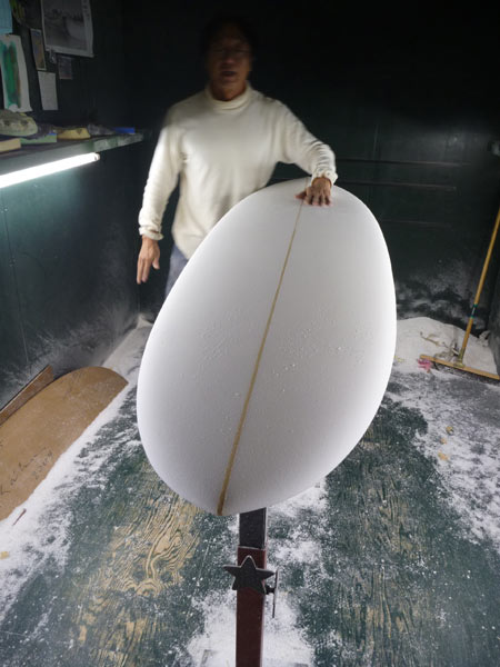 カツさんはEPSフォームのツインフィンをシェイプ中でした。BONITOというモデルです。BONITOはツインフィンに小さなセンターフィンを加えたツインスタビライザーです。かっとび&ドライブ系のボードでフィッシュで短いボードに乗り始めたサーファーに、フィッシュのネクストボードとしてオススメのモデルです。
