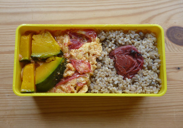 トマトと卵の炒めものにカボチャの焼いたの、それに玄米ご飯と梅干です。走るためにいいメニューってあるのかしらん?研究してみます。