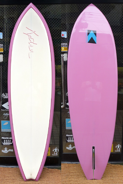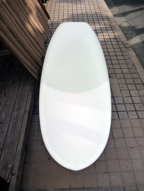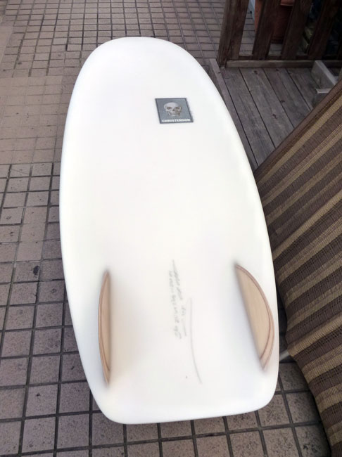 シェイプにも気合い入ってます。薄めのノーズから緩いカーブのデッキにラインがきれいに繋がってます。ボトムはコンケーブ。フィンはツインスタビのカスタムグラスフィンです。