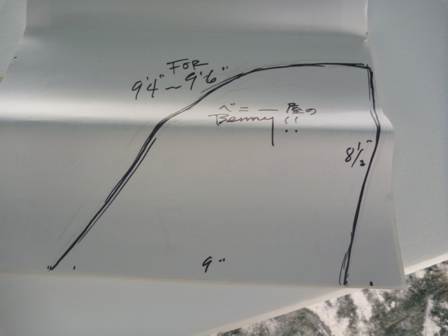 かなりクラシックなイメージのボードなのでいつものロゴマークは入れず、カツさんのシェイプサインと「K.K.S.E.」という小さい四角いロゴだけにしてもらおうと思っています。