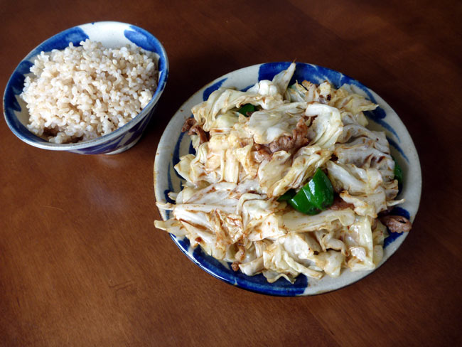 たっぷりのキャベツと羊のお肉を味噌味に炒めたおかずに山盛り玄米ゴハン。クリックして大きくして見てください。うまそうでしょう?