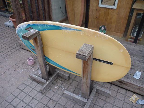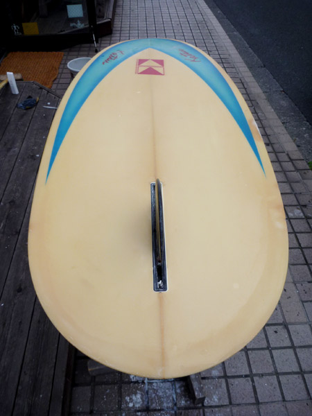 これから本格的に使うつもりなので、キズをすべて直してオーバーホールしてあげました。31年前のボードにしてはいいコンディションですが、レールに水を吸いそうなキズがたくさんあります。