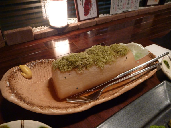 昨夜は久しぶりのお酒ですっかり楽しくなってしまいました。店で大根おでんを頼んだらこれが出てきました。インパクトありすぎで思わず笑っちゃいました。アイデアものですね。美味しかったです。