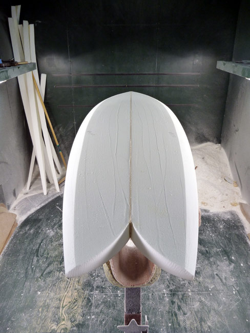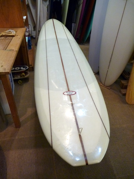 見れば見るほどいいですね~、このボード。細いポイントノーズと、気持ちよく滑ってくれそうなヒップがなんともいえません。最近またまたロングボードに入れ込んできているせいか、見ているとワクワクしてしまいます。このワイドなテールに乗って波を滑ってターンさせたときのグライド感、想像してしまいます。