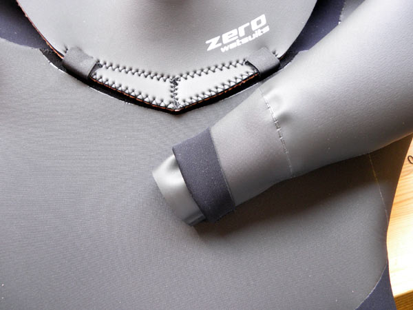 首周りと手首、足首の二重の水切りが付き、ブーツとグローブを着用すれば限りなくドライスーツに近い保温性を発揮します。