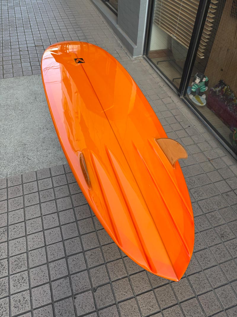 チャネルが入ったツインフィンは今は主に6’6”で作っていますが、このニーボードくらいの7フィート前後のミッドレングスサイズも面白いと思います。(このボードはニーボードなので幅が広いです)