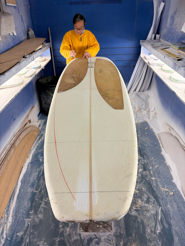 特注でフラットに近くロッカーを落としてあります。それに加えてCLASSICウェイトの高密度発泡です。活さんはレギュラーの発泡よりひとつ高い発泡密度のブランクスをいつも使っています。それはレギュラーのものより約10%重くなるのですが、このブランクスはさらに高密度で、レギュラー発泡のブランクスよりも約30%重量が増します。