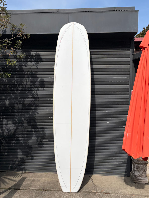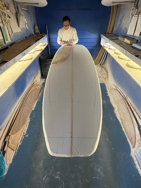 これで行きます。前回お見せしたものよりノーズは少しふくらんでいます。レングスは両側のラインがノーズで自然とつながるところに任せてみました。考えていたのは9’2”でしたが、1インチ伸びて9’3”になりました。