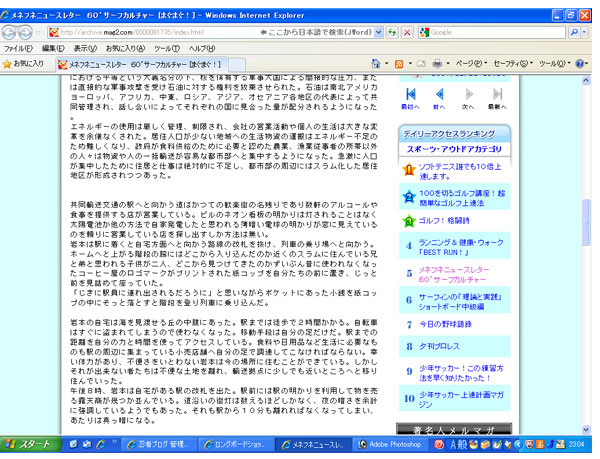 それから、一昨日、昨日とメネフネニュースレターがまぐまぐのアクセスランキングにランクインしています。サーフィンだけじゃなくて、ゴルフやテニス、野球、サッカー、ランニングなど何千とあるスポーツカテゴリーの中でありがたいことです。まあ、今日まででしょうが…でも皆様のおかげです、ありがとうございます。