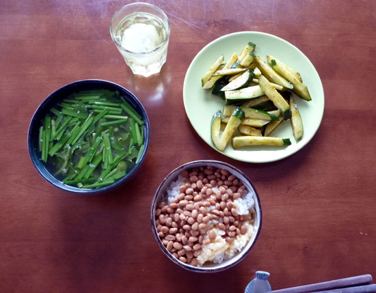 そんなことをやっているとすっかりお昼。新潟の親戚にいただいたコシヒカリの白米が少しだけ残っていたので、納豆とキュウリの和えもの、アシタバ、ニラ、ししとうの野菜たっぷり味噌汁のお昼ごはん。野菜はすべて庭から取ってきたばかり。炊きたてのどんぶりご飯とで幸せの図です。
