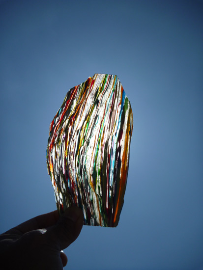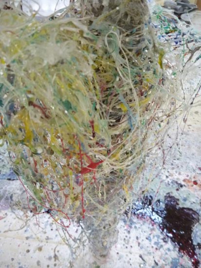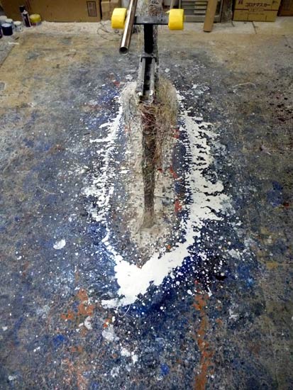 顔料を混ぜ、着色された樹脂が銀色のクロスの上に広がり、沁み込んでいく様子は何度見ても見飽きない光景です。